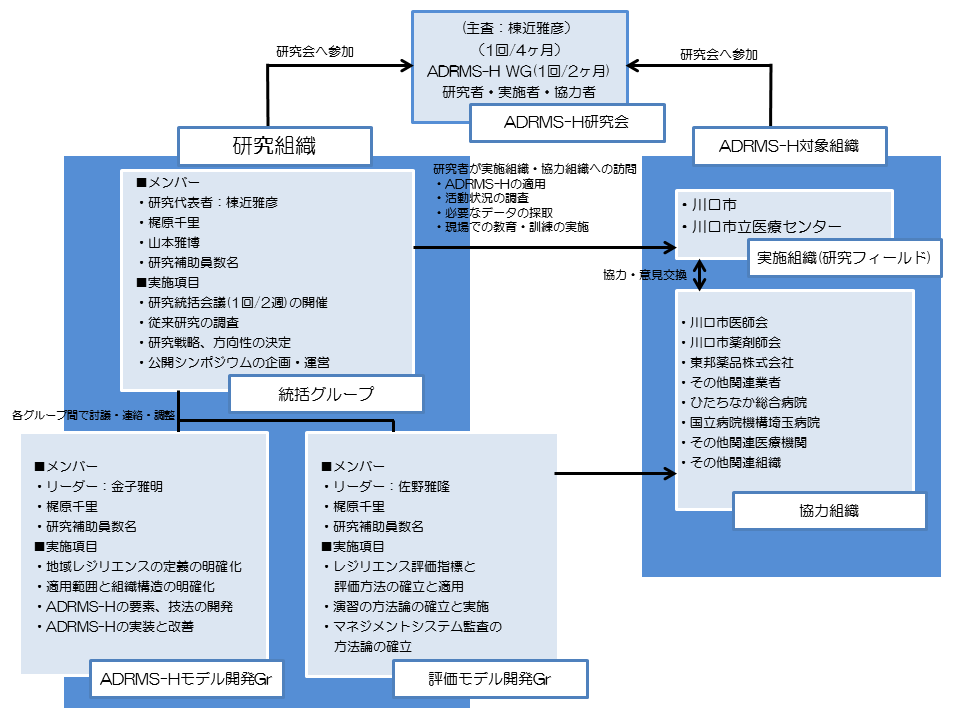 研究の体制としては最上位にADRMS-H 研究会を設置します。この研究会は、研究者、実施者、研究協力者等から構成されます。全体会を4ヶ月に1回程度、ワーキングを2ヶ月に1回程度の頻度で実施します。 ここではADRMS-H のモデル開発および導入・推進上の課題の検討、進捗状況の報告 、必要な教育等を行います。